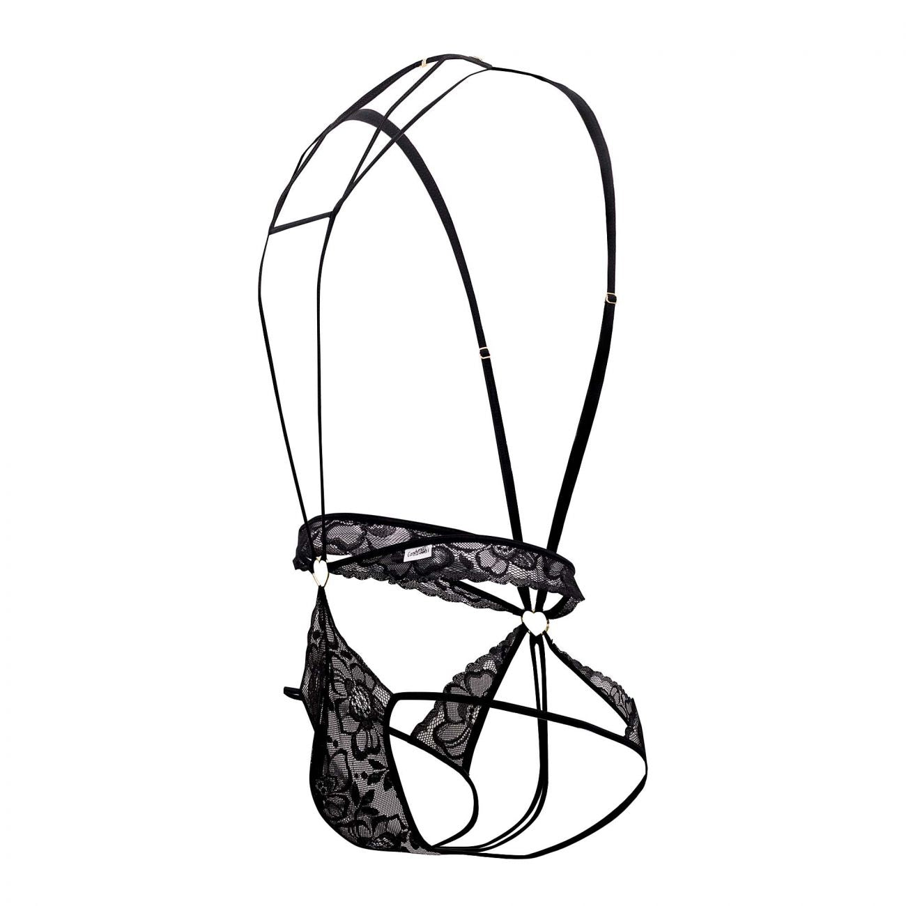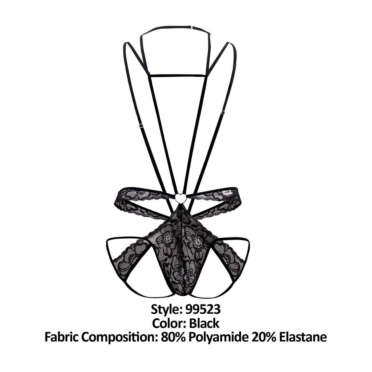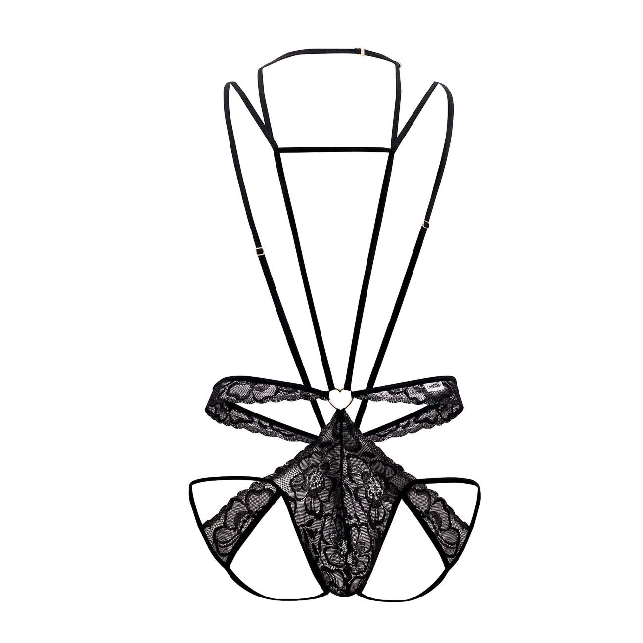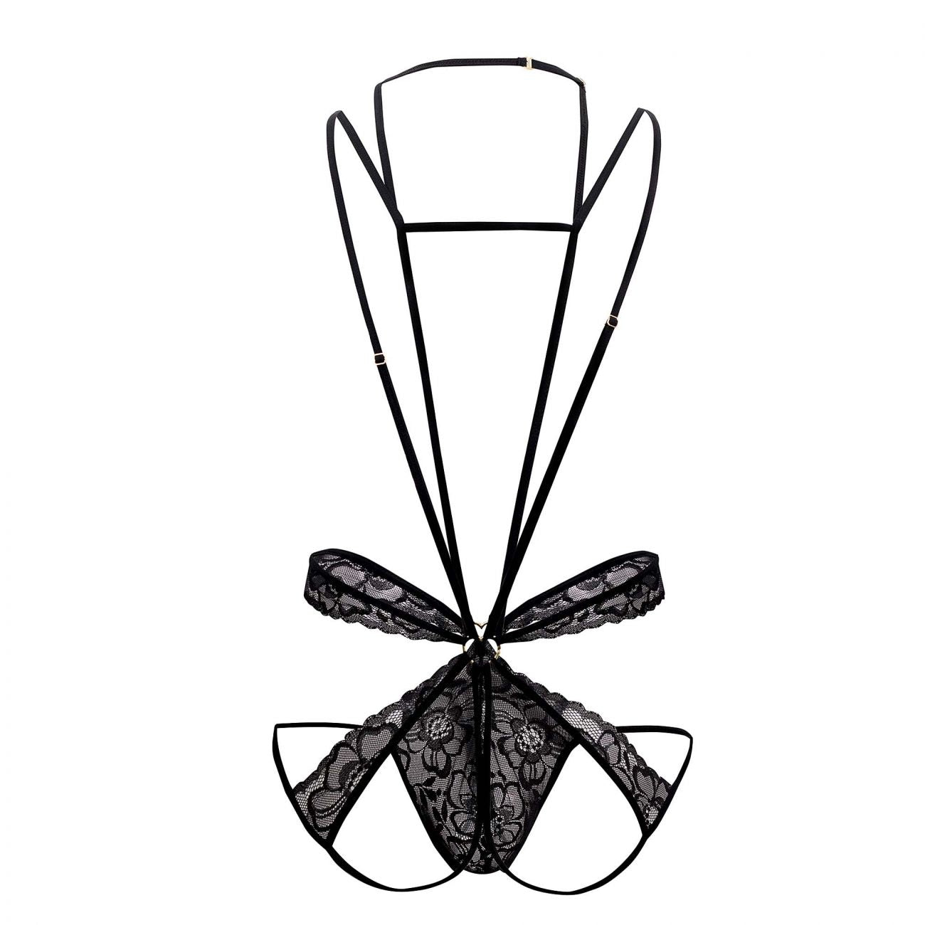 Ultra-sexy bodysuit, with thin adjustable straps that wrap your body all along from the neck offering the support you need. Lace jockstrap with minimal rear coverage, so soft you barely feel is there, with sexy lace strap details. Metal ring detail on front and back.