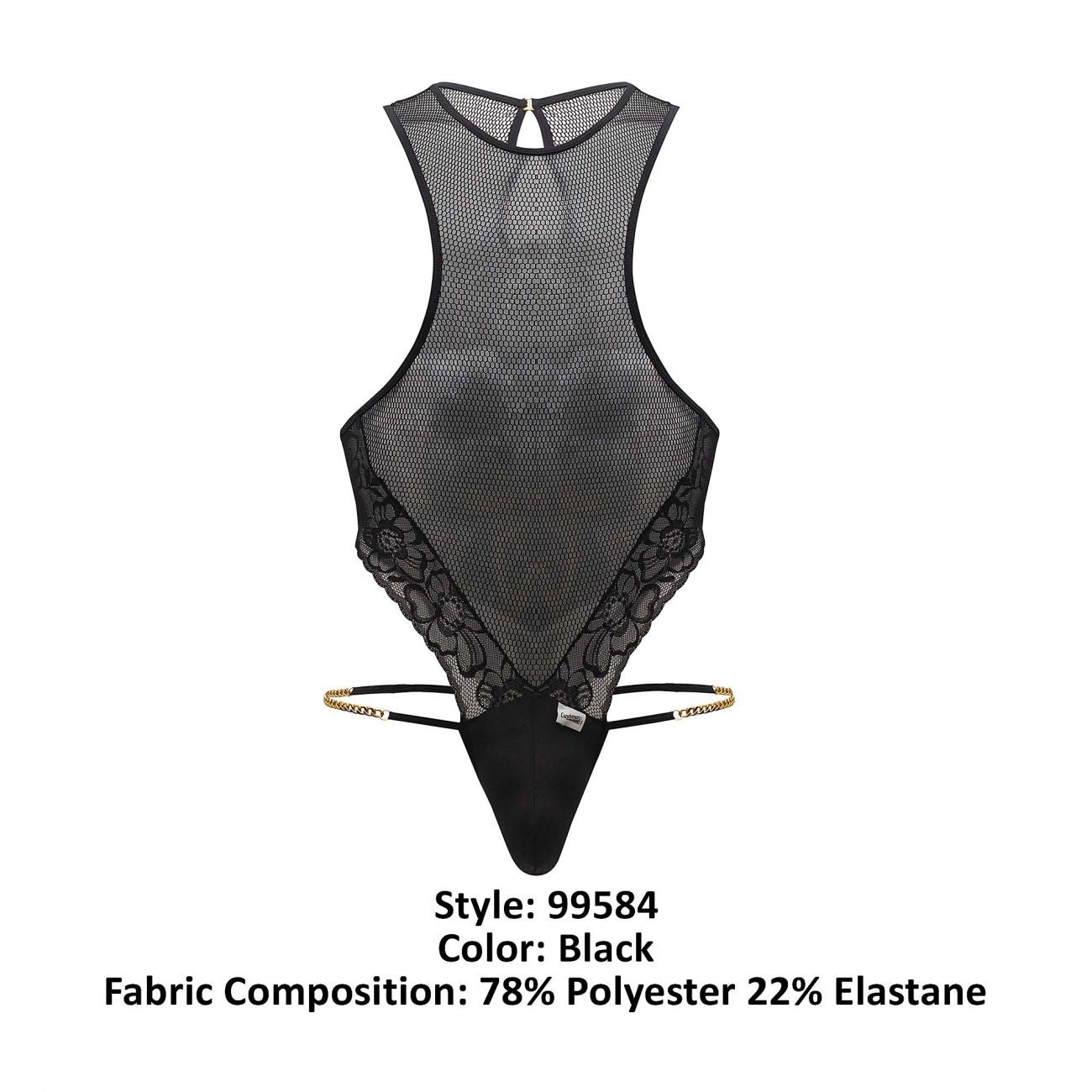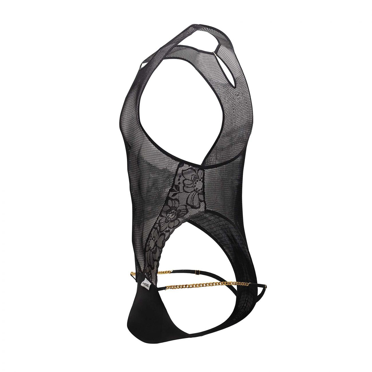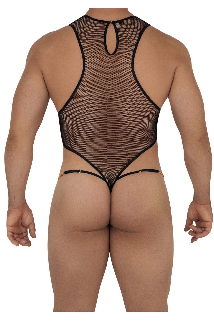 Enjoy your sensuality in this suggestive bodysuit in sheer mesh and lace details on the front and back. Minimal coverage.