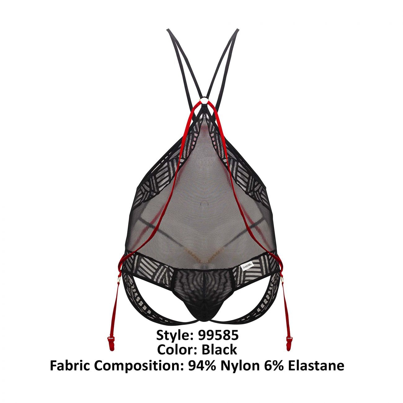 Enjoy your sensuality in this suggestive bodysuit in sheer mesh and lace details on the front and back. Minimal coverage. Tights not included.