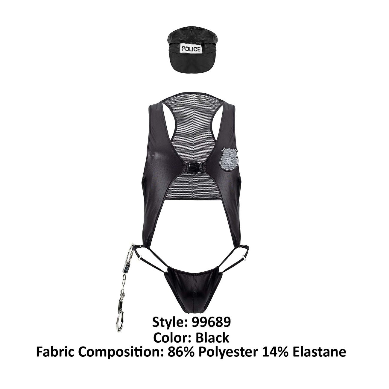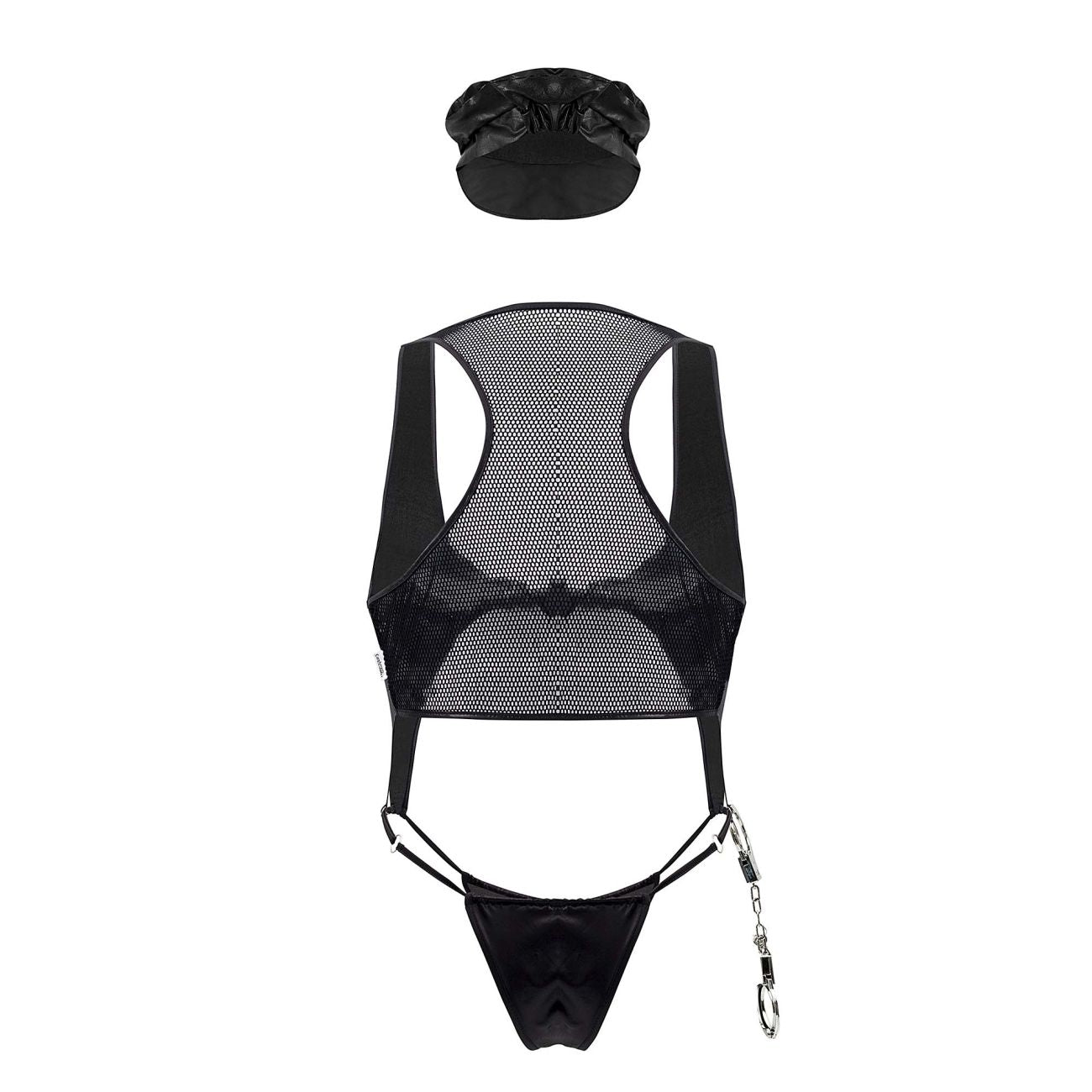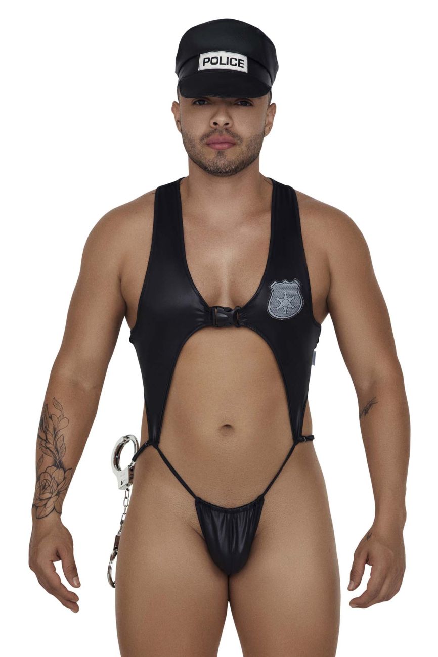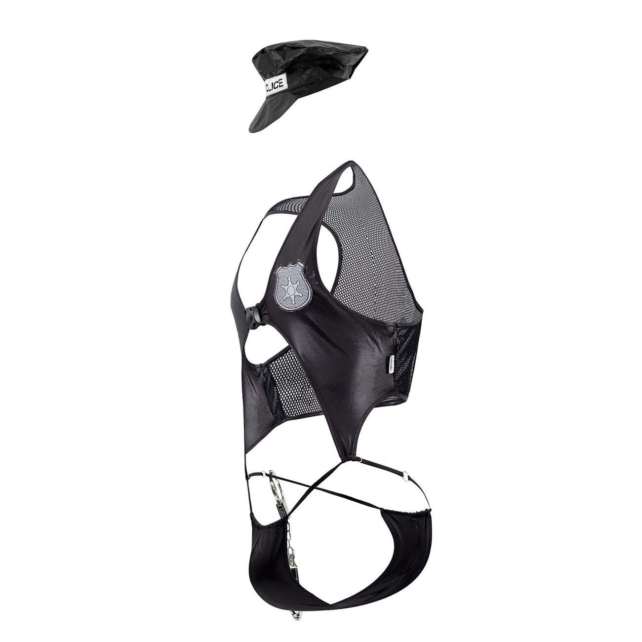 Catch all the bad guys with this sexy police costume. Includes wet-look fabric top, matching panty, handcuffs and headpiece.